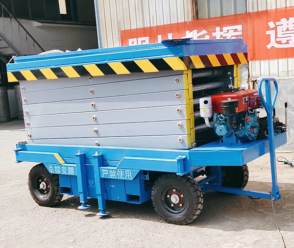 柴油機(jī)四輪移動(dòng)式升降平臺(tái)除具備普通四輪移動(dòng)式升降平臺(tái)優(yōu)點(diǎn)外,它的最大特點(diǎn)是升降速度可以調(diào)節(jié),這是一般升降平臺(tái)所不具備的。